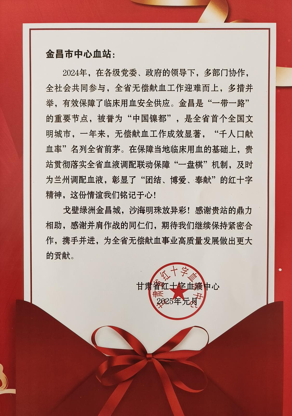近日,金昌市中心血站收到了一封来自甘肃省红十字血液中心的感谢信。信中写道:“一年来,(金昌市中心血站)无偿献血工作成效显著,‘千人口献血率’名列全省前茅。在保障当地临床用血的基础上,贵站贯彻落实全省血液调配联动保障‘一盘棋’机制,及时为兰州调配血液,彰显了‘团结、博爱、奉献’的红十字精神,这份情谊我们铭记于心!”